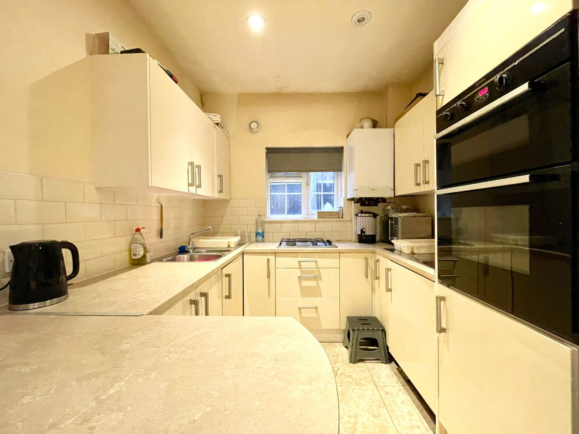 The property benefits from a spacious kitchen equipped with a gas cooker, double sink, and 2 built-in oven, offering plenty of storage and worktop space. -